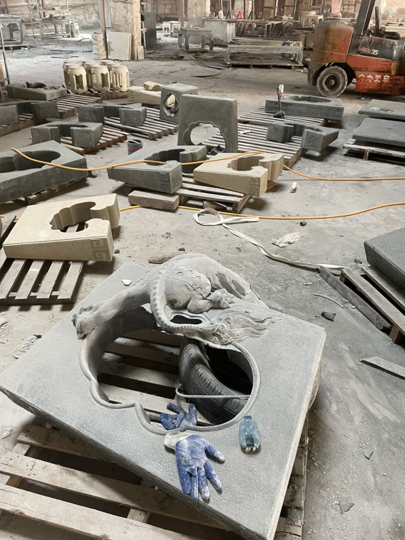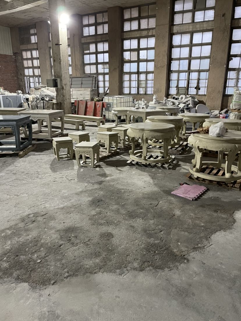本工厂是采用天然石英石。 大理石.花岗石原材料。 独特配比、精磨高分子水泥、无机颜料,《不含树脂、胶水等有机成分》,通过纳米合成技术,高频高压震动压制成型的无机人造石产品。 再经过人工传统雕刻工艺加工