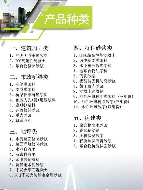 建筑加固,市政桥梁,地坪类,房建类,特种砂浆类